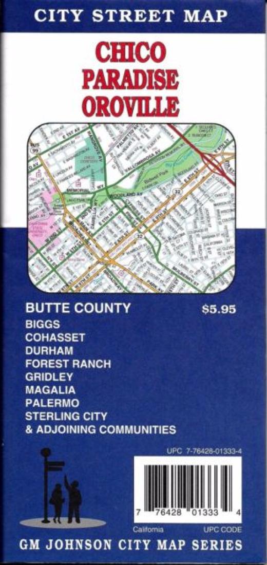 City map of Chico Paradise with legend and places of interest index. Insets of Cohasset, Forest Ranch, Stirling City, Nelson, Nord, Dayton, Richvale, Durham and Yankee Hill. On reverse map of Butte County with city and street index. Insets of Gridley, Palermo, Robinson Mills, Berry Creek, Honcut, Groville and downtown Groville.