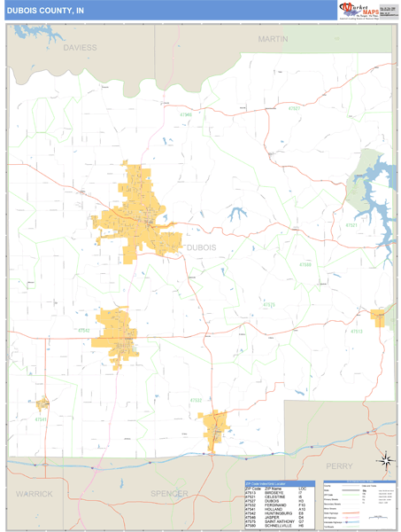 Dubois County, Indiana Zip Code Wall Map was created specifically with businesses in mind and offers only that data that is essential for business functions and decision making, tracking sales territories, and for general reference.