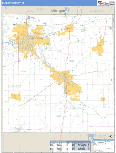 Elkhart County, Indiana Zip Code Wall Map was created specifically with businesses in mind and offers only that data that is essential for business functions and decision making, tracking sales territories, and for general reference.