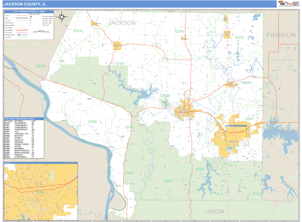 Jackson County, Illinois Zip Code Wall Map was created specifically with businesses in mind and offers only that data that is essential for business functions and decision making, tracking sales territories, and for general reference.