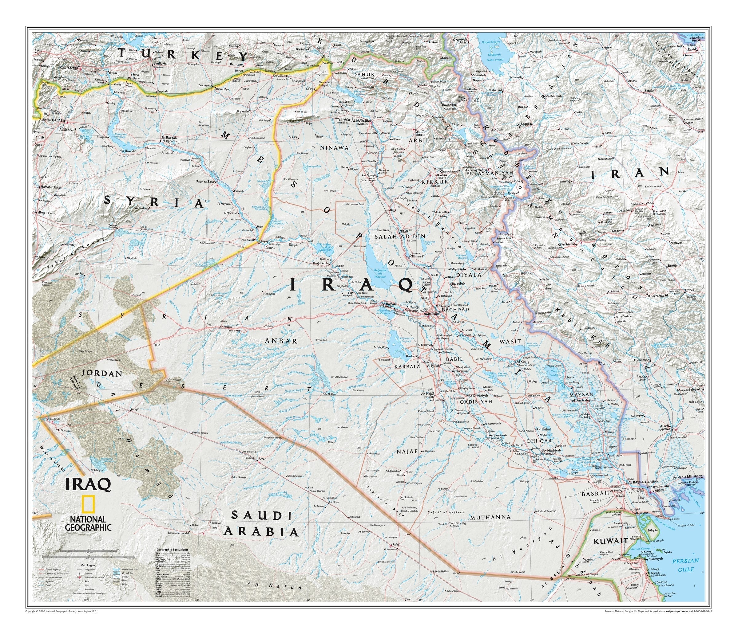 In the news every day, this Wall Map of Iraq by National Geographic is up-to-date and highly detailed. It features thousands of place-names with highly accurate political boundaries. It makes use of National Geographic's classic styling and shaded relief to show physical terrain, this map is both a useful reference tool and a quality piece of art, perfect for any home, office or classroom.
