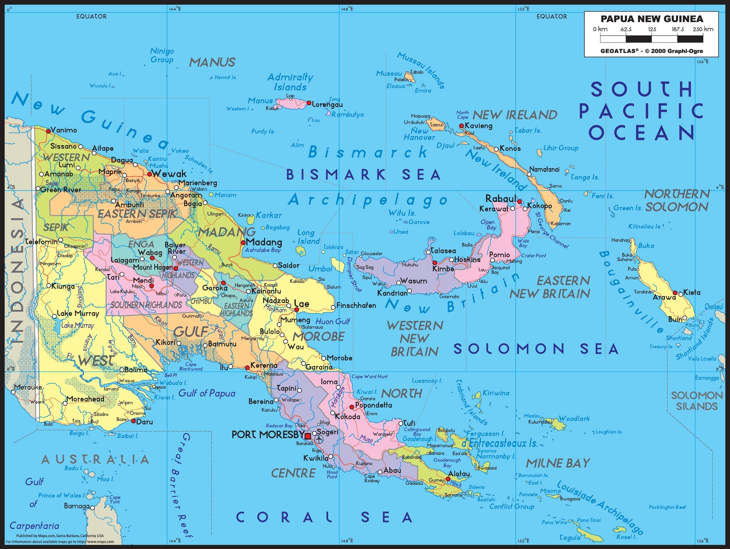 This Papua New Guinea Political Wall Map is ideally suited for light reference. As a part of this Atlas-style map series, the Papua New Guinea Wall Map includes portions of adjacent areas, bringing an almost regional map feel to a country map presentation.