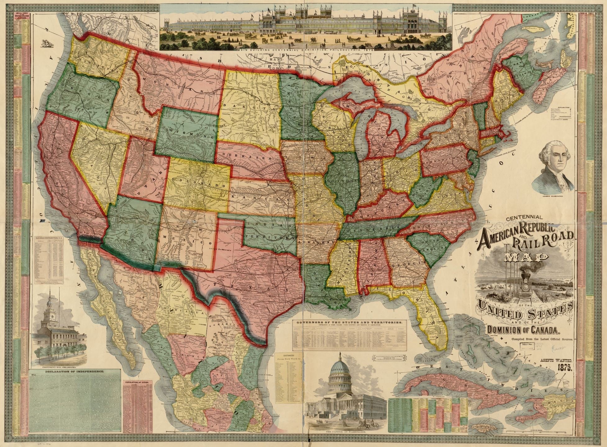 Shows drainage, cities and towns,and the railroad network with names of lines. Includes distance chart and view of "Main building centennial exhibition, Philadelphia, 1876."