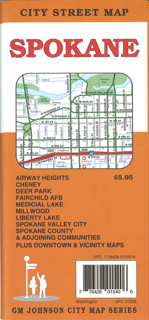 City map of Spokane with legend and points of interest index. Insets of downtown Spokane, Deer Park, Medical Lake, Cheney, Fairchild AFB, Spangle, Rockford, Fairfield, Waverly and Latah. On reverse insets of Spokane County, Spokane and vicinity with city and county index.