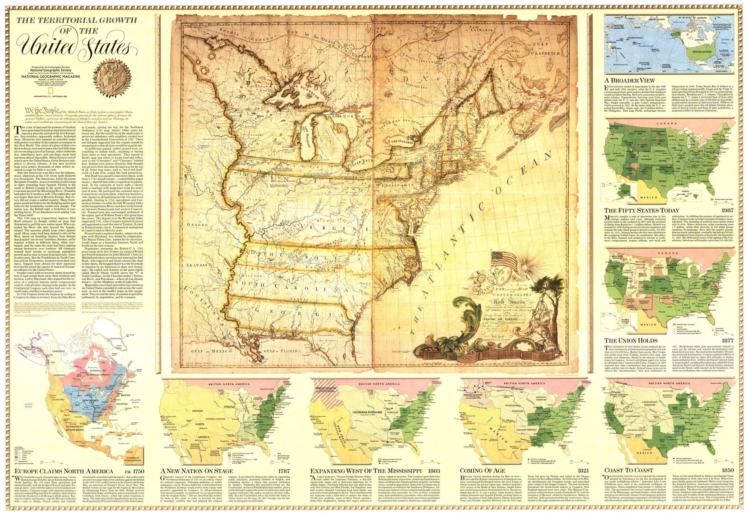 The 1987 Territorial Growth of the United States map features:• Seven inset maps showing territorial growth from 1750 through 1987