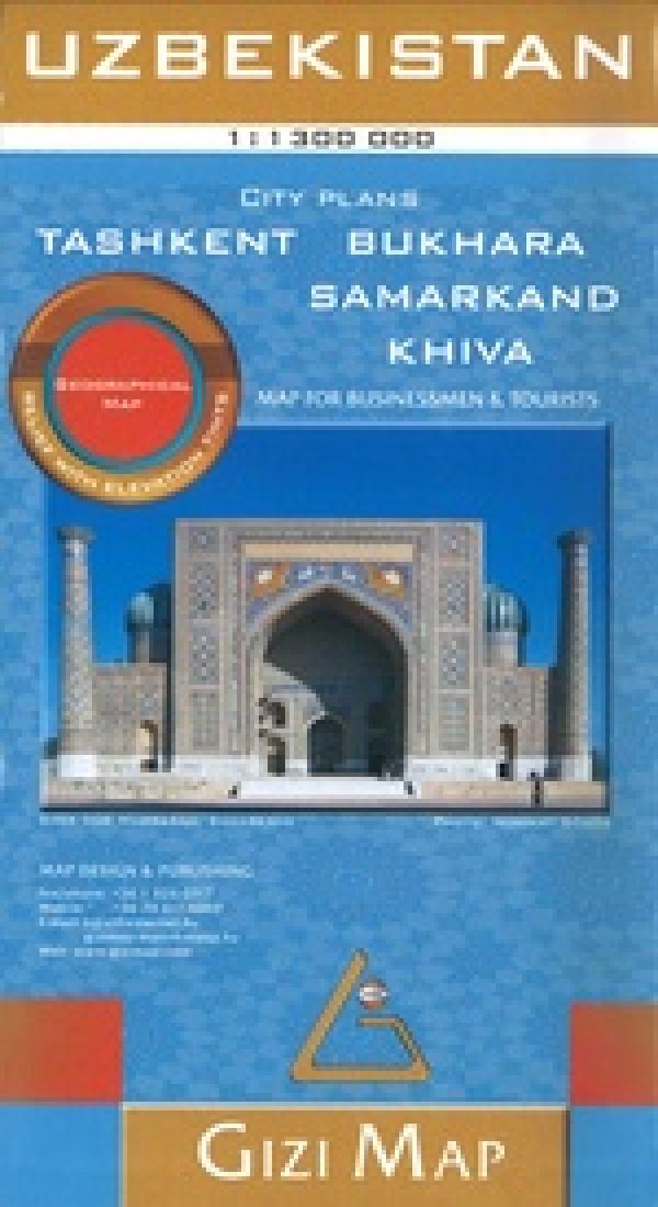 This Gizimap title provides road details and tourist information for the country of Uzbekistan at 1:1,300,000 scale. This map includes inset maps of Tashkent, Bukhara, Samarkand, and Khiva.