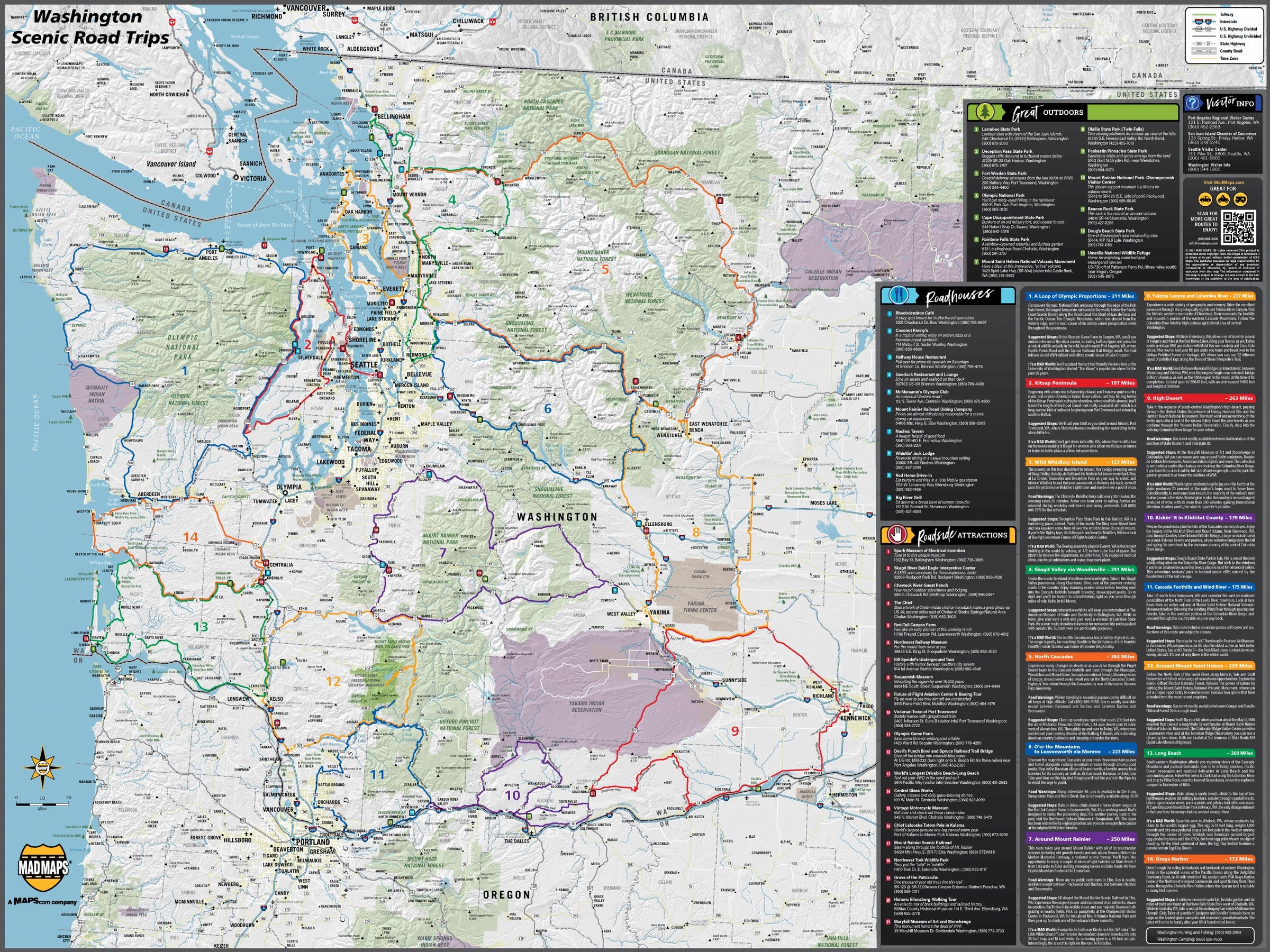 This is a wall map version of the Washington side of our popular Washington and Oregon scenic road trips folded map from MAD Maps. The wall map does not have any fold creases and is perfect for framing or hanging on a wall.